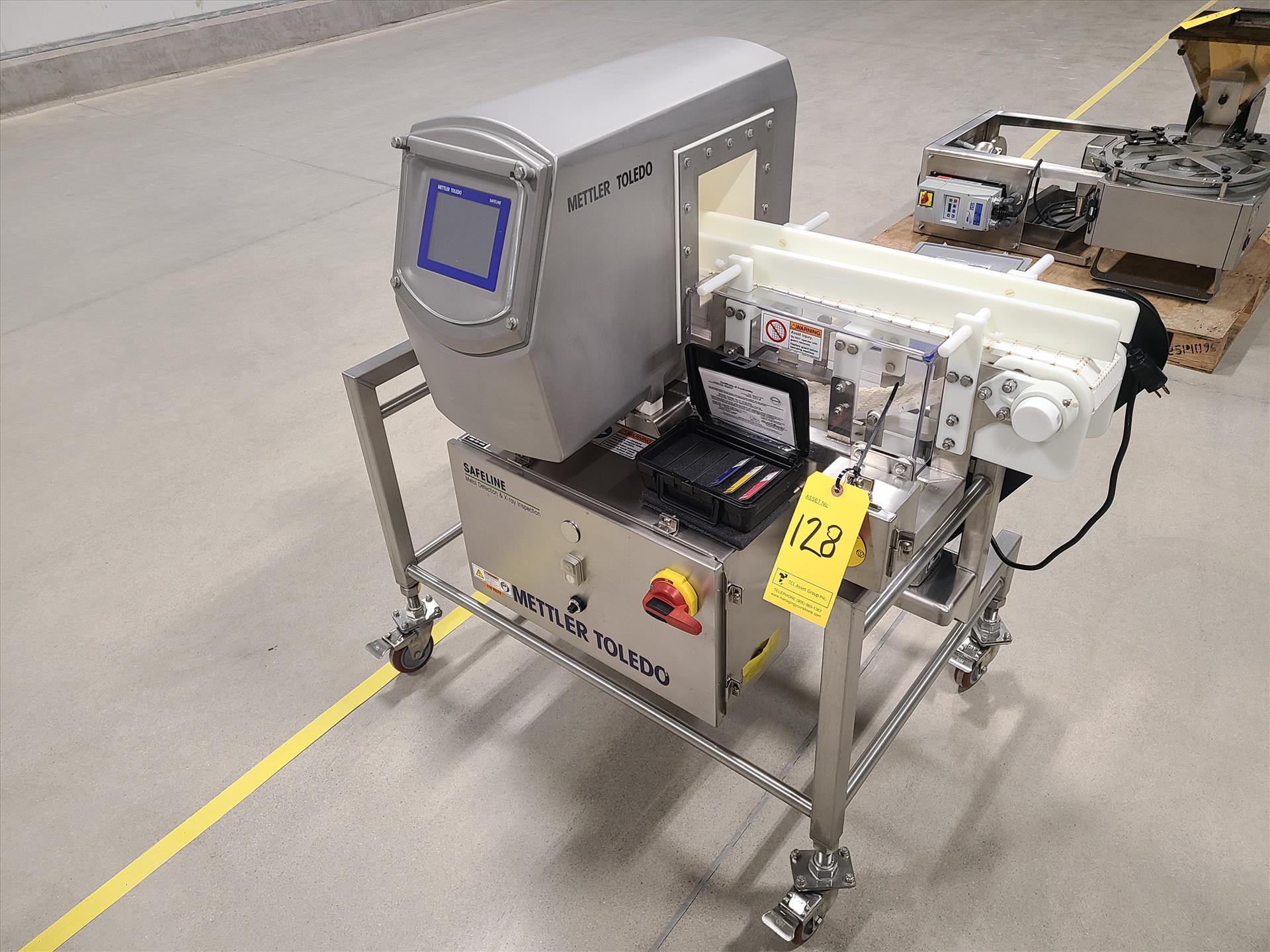 Mettler Toledo metal detector Model SL1500, ser. no. 8419101 (2015), stainless steel, approx. 6 in. x 8 in., approx. 4 in. x 48 in. belt conveyor w/ casters