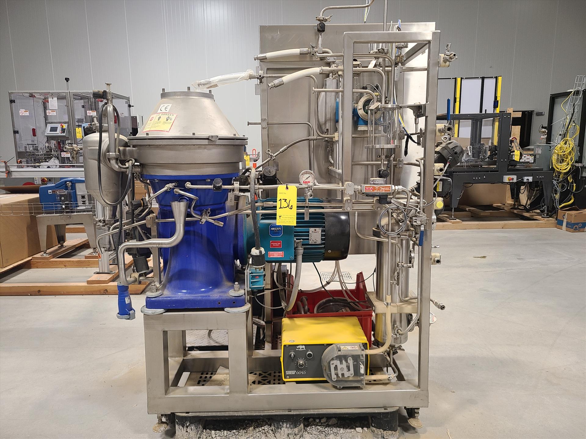 Alfa Laval Disc Centrifuge, model BTPX205-SGD-34CDP-50, ser. no. 4091604, 6.5 kW w/ Watson Marlow 604s peristaltic pump, EH flow meter, control panel w/ AB PanelView Plus 700 controls, misc. valves and filters w/ casters