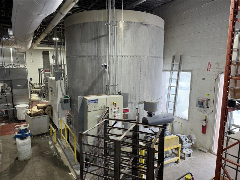 Guerin Bulk Flour Silo, 12ft diameter;16ft height, 230 volt, SS, w/ 30 tonnes capacity with fluidization system, positive blowers and flour delivery system with hoppers above Peerless mixers [Loc. Dough Mixing - Bulk Storage]