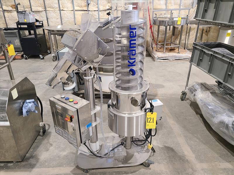Kramer Tablet Deduster, model KD3015-500/CEIA, S/N KD3015-0039, w/Ceia metal detector, model THS/PH21E, 2 A, 110 Volts, 60Hz , casters (2019)