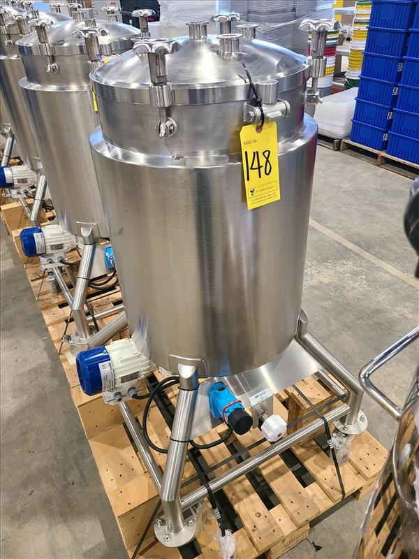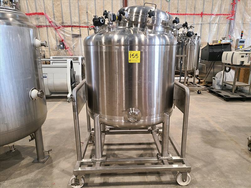 Industries D acier Inoxydable Itee Blending Tank, stainless steel, approx. 600L capacity, model 3-3-F-X-TMR-3-2, S/N 307, w/ CIP spray ball, bottom mounted mixer, 1.4A, 575 Volts, 60Hz, casters (2018)