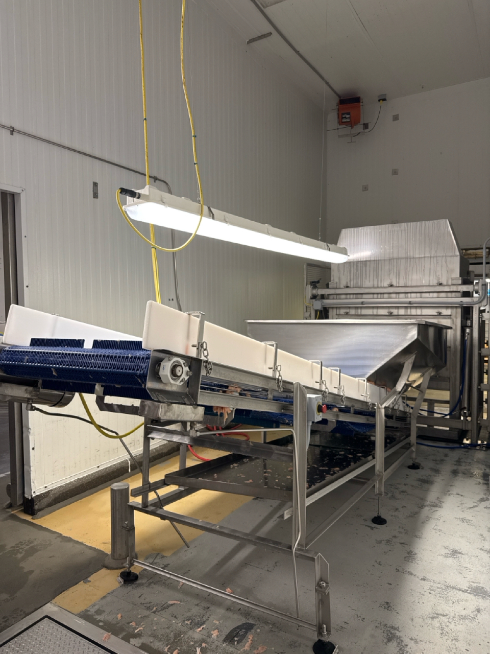inclined fluted-belt conveyor, approx. 30 in. x 13 ft. w/ hopper, stainless steel, washdown [Loc. Massage]