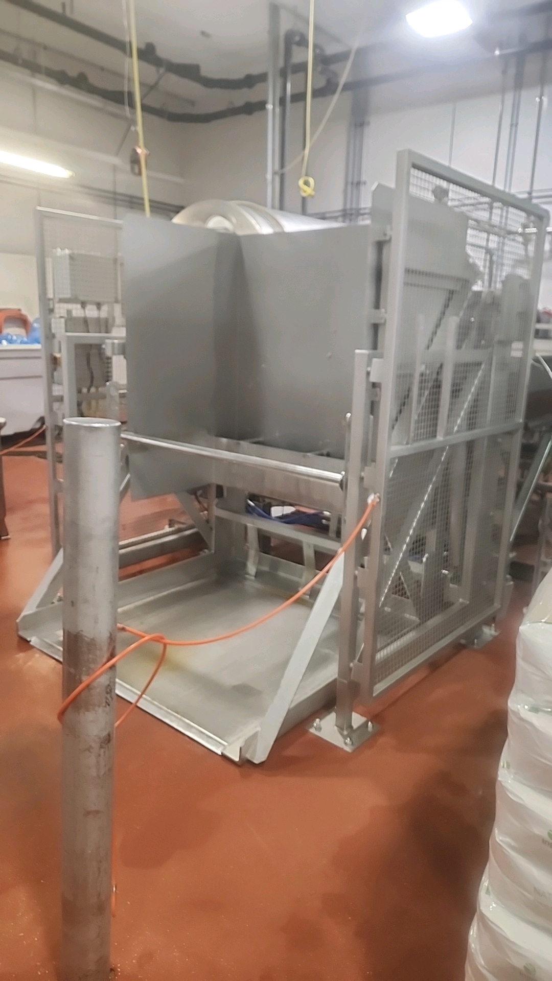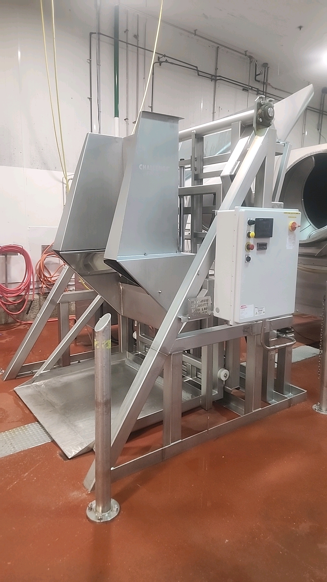 Challenger-RMF industrial pivot dumper, stainless steel, 3000 lbs cap. w/ Schnieder Harmony touch screen controls, approx. 48 in. x 52 in. x 96 in. lift height c/w hydraulic pack and safety fencing [Loc. Massage]