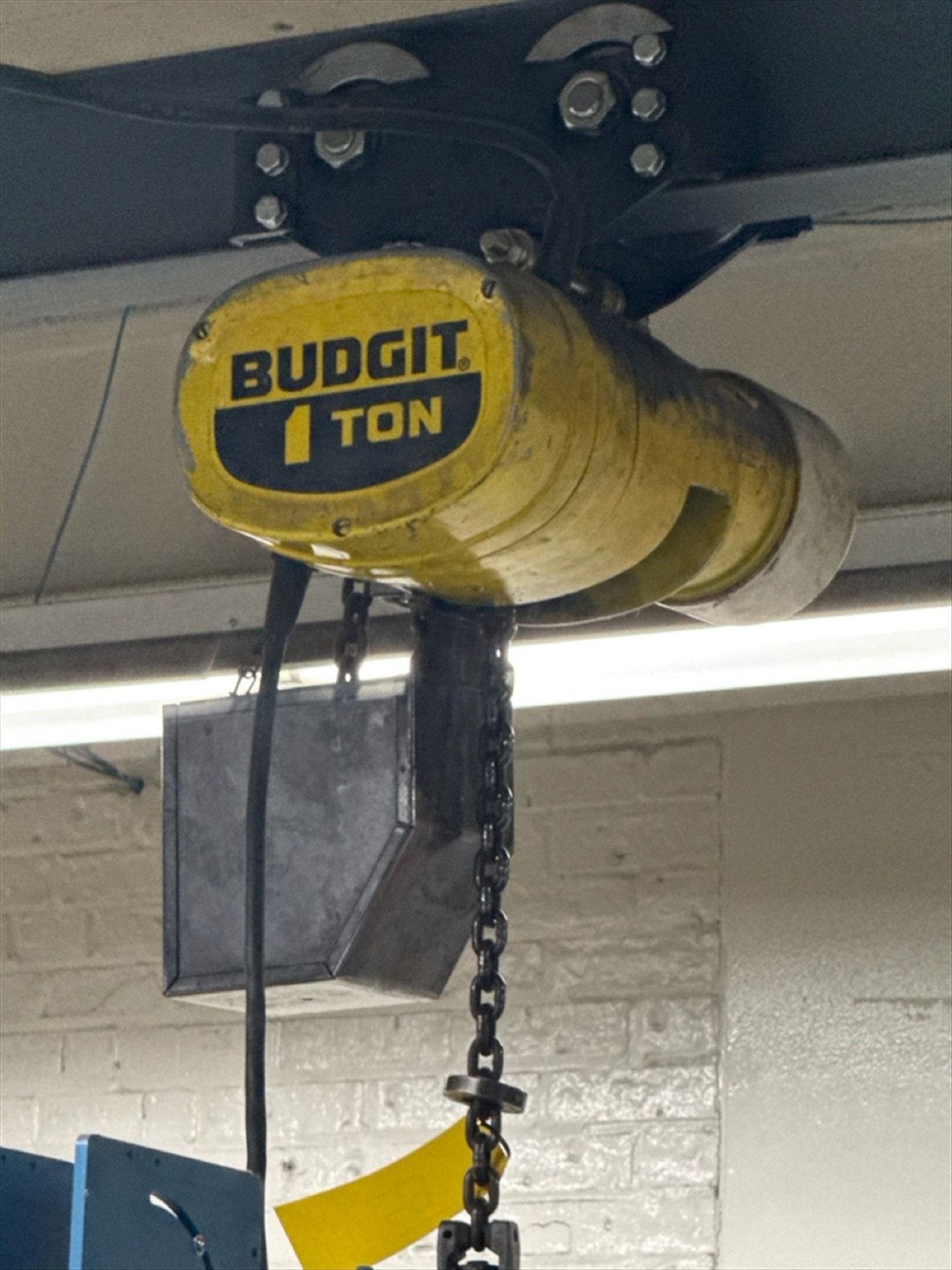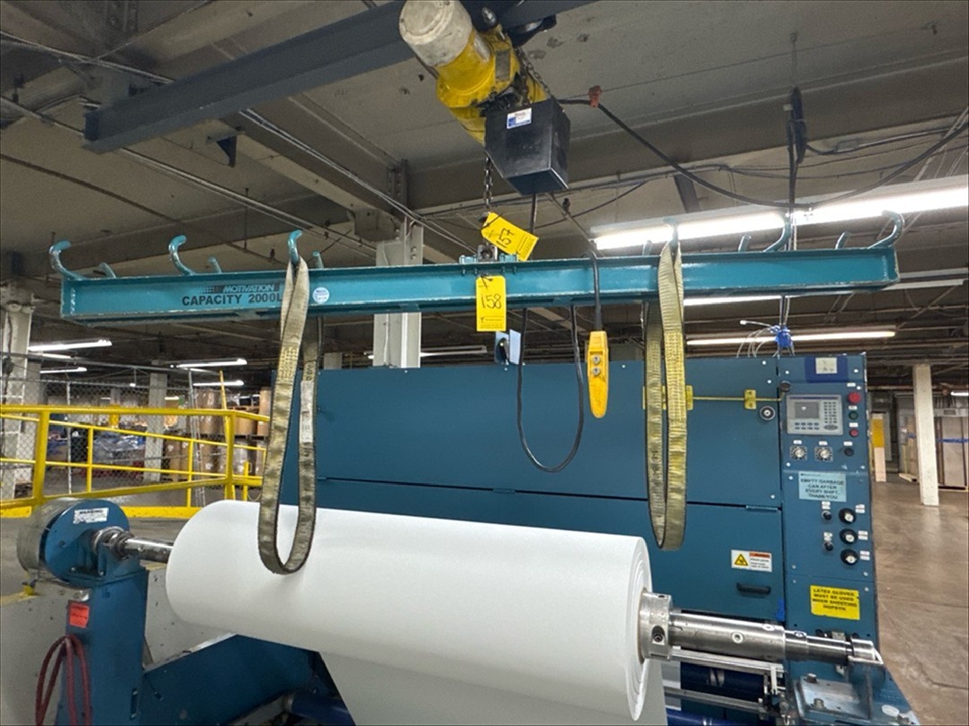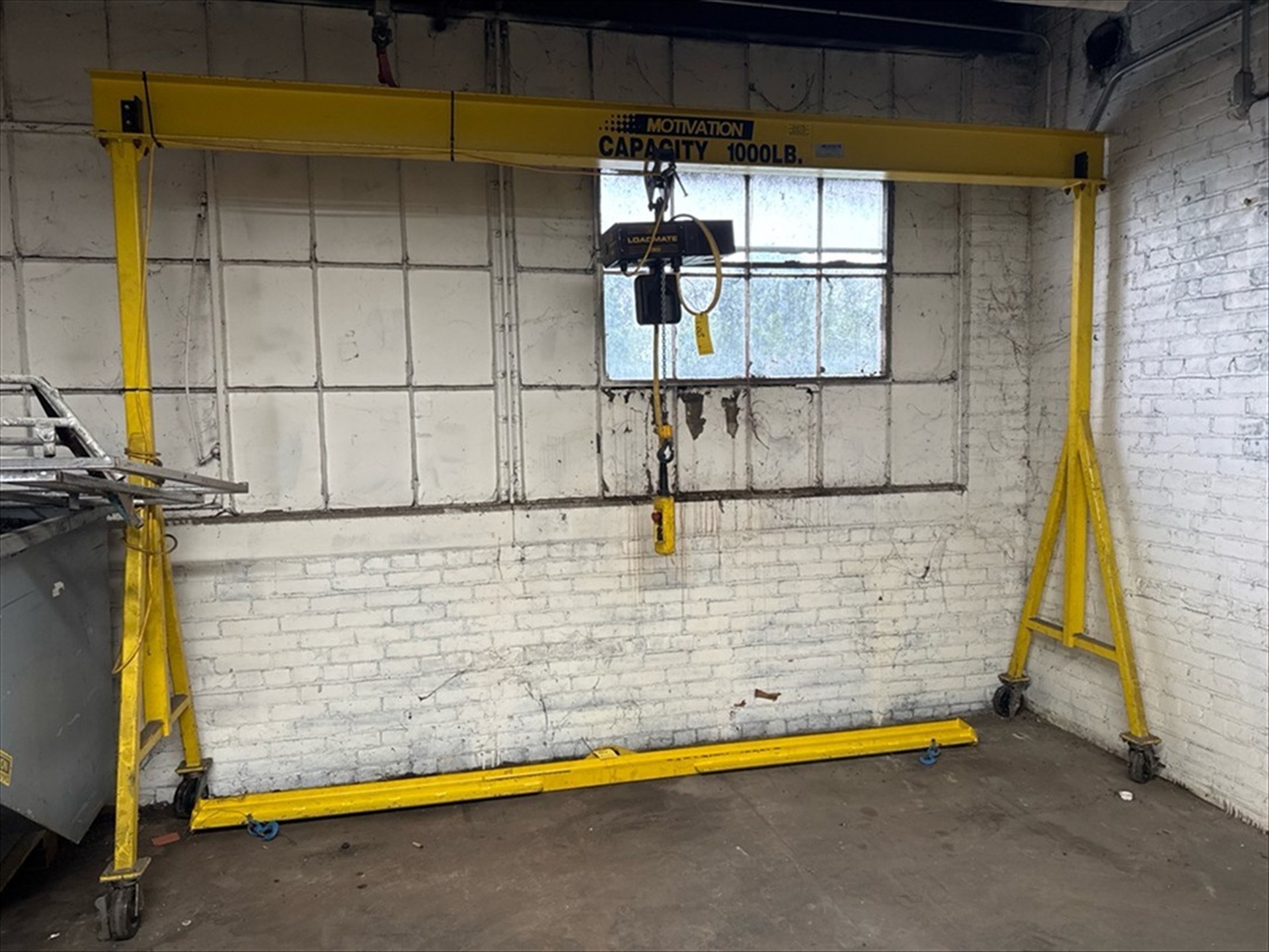Motivation Gantry Crane, Mobile, 1000-Lb Cap., 12 ft. Span, 8 ft. H, W/Loadmaster Mod. LM-05 Electric Powered Chain Hoist 1/2-Ton Cap., W/Pendant Control, and 1000-Lb Lifting Bar [Loc. Greenwich, Flr. 4]