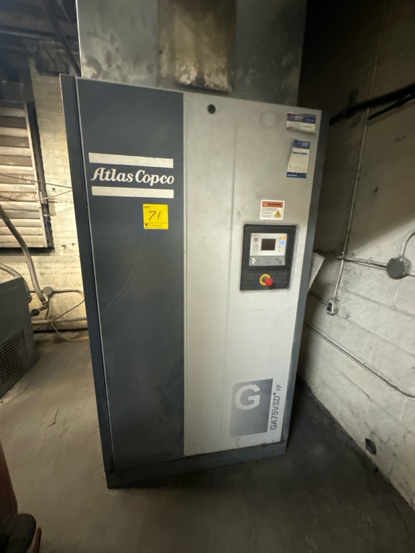 Atlas Copco Mod. GA75VSD+FF Rotary Screw Air Compressor, 100-Hp, 185-Psi, W/2000 Steel Fab Inc. Vertical Air Tank, 200-Gallon Cap., 200-Psi, Ser. No. AP1862675 (2018) [Loc. Greenwich, Flr. 1]