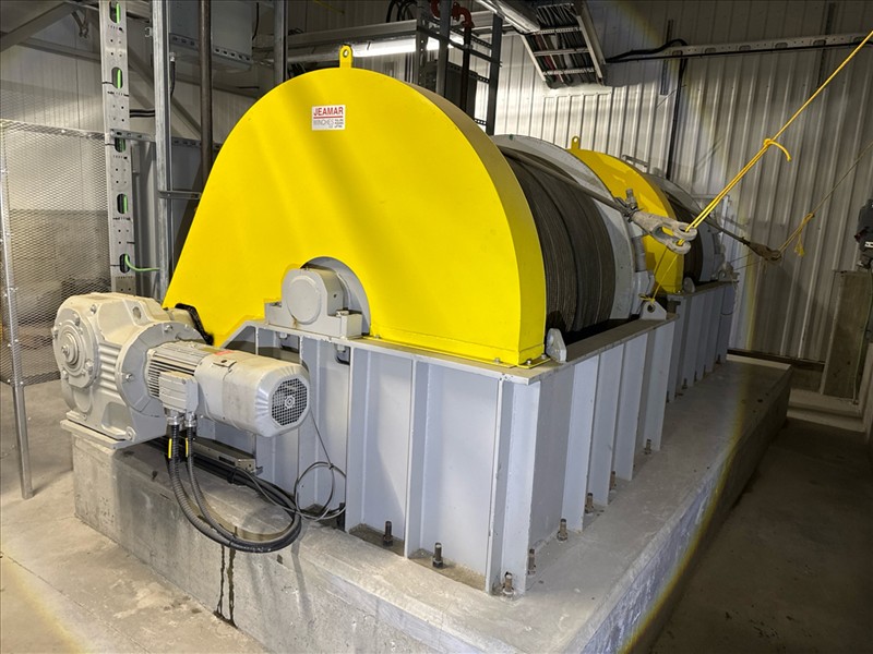 Jeamar electric lifting winch, mod. E110-1-10E, ser. no. 9770 (2016), 10 hp 40 in dia. X 55 in. drum, 1 in. rope, 14500 lbs./20.3 ft./min./3437 ft. cap. c/w starter and transformer [Loc. FAR]