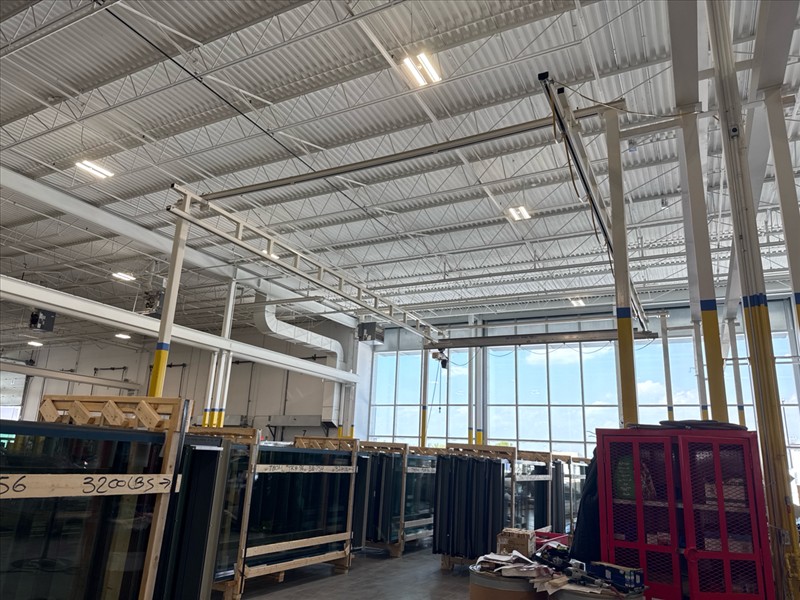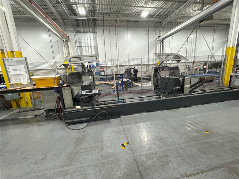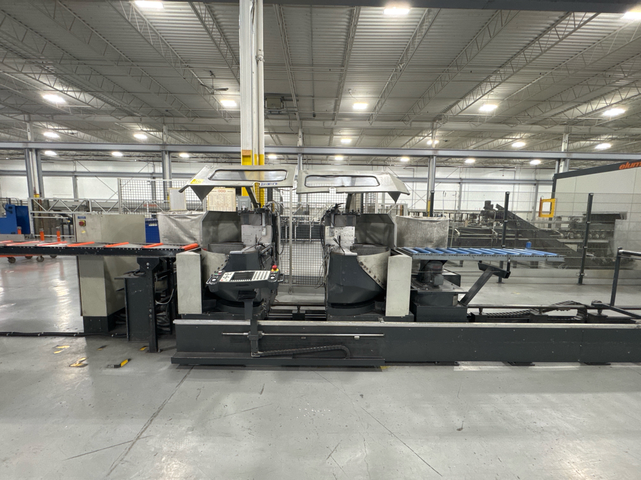 Elumatec Double-Head Miter Saw (5-axis, 6m), mod. DG244/01, ser. no. 2445530411, w/ approx. 20 ft. rail, PLC panel, E550 controls, dual dust collectors, infeed/outfeed conveyors [Loc. Fabrication]
