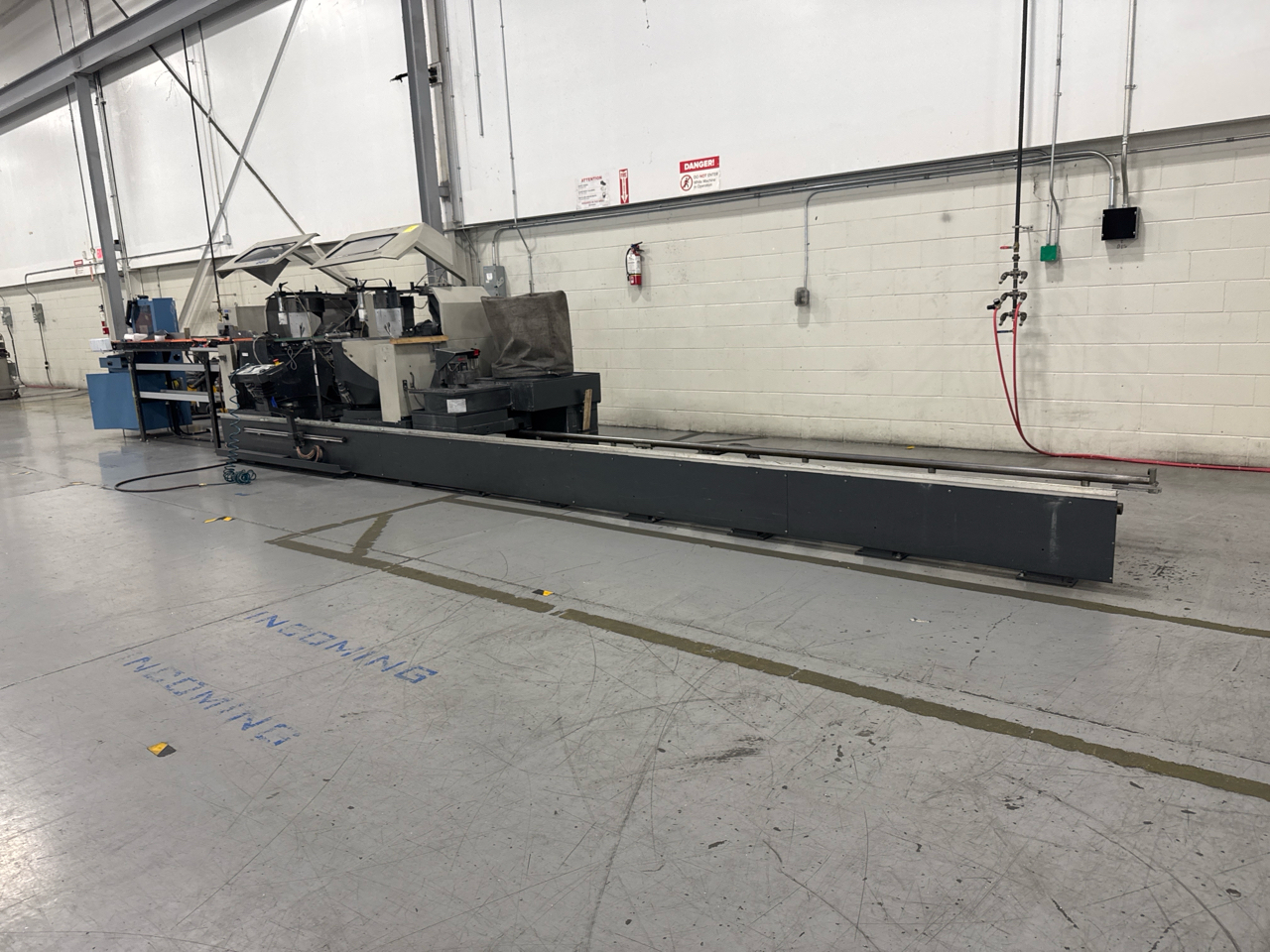 Elumatec Double-Head Miter Saw (5-axis, 6m), mod. DG244/02, ser. no. 2445530415, w/ approx. 20 ft. rail, PLC panel, E550 controls, infeed/outfeed conveyors, transformer [Loc. Fabrication]