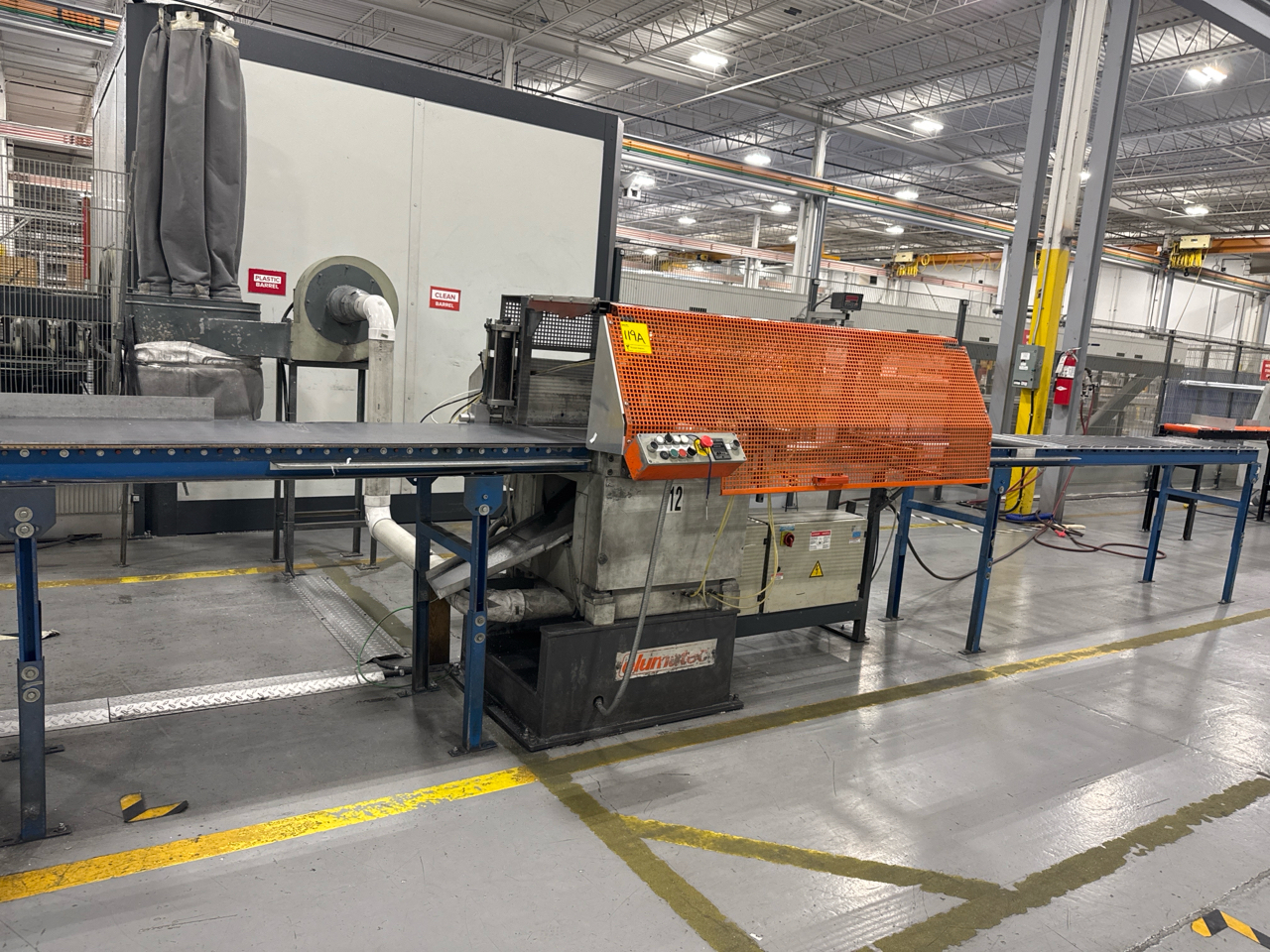 Elumatec Auto-Feeding Saw, mod. SA142/25, ser. no. 20051, w/ dust collector, 12 in. x 120 in. infeed/outfeed conveyor [Loc. Fabrication]