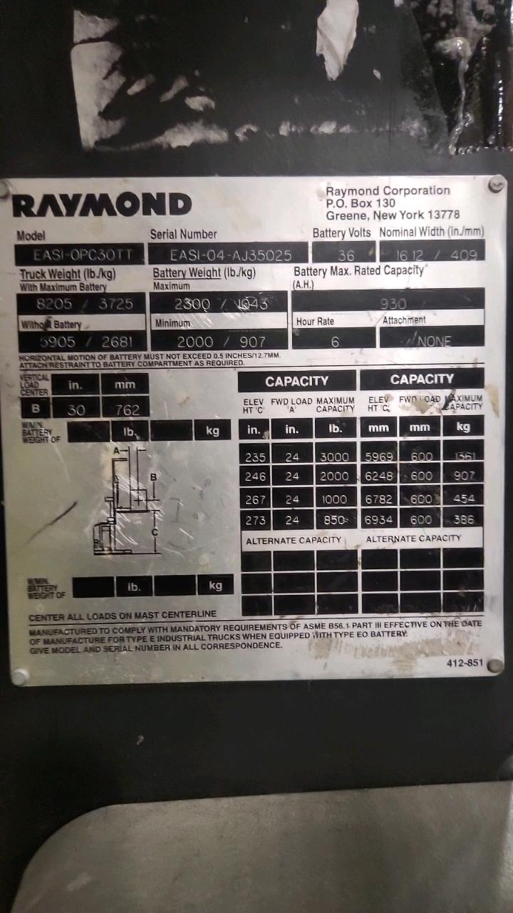 Raymond Order Picker Forklift mod. EASI-OPC30TT ser. EASI-04-AJ35025, 36 V., 3000 lb cap, 20 feet max lift height, 611 Hrs.
