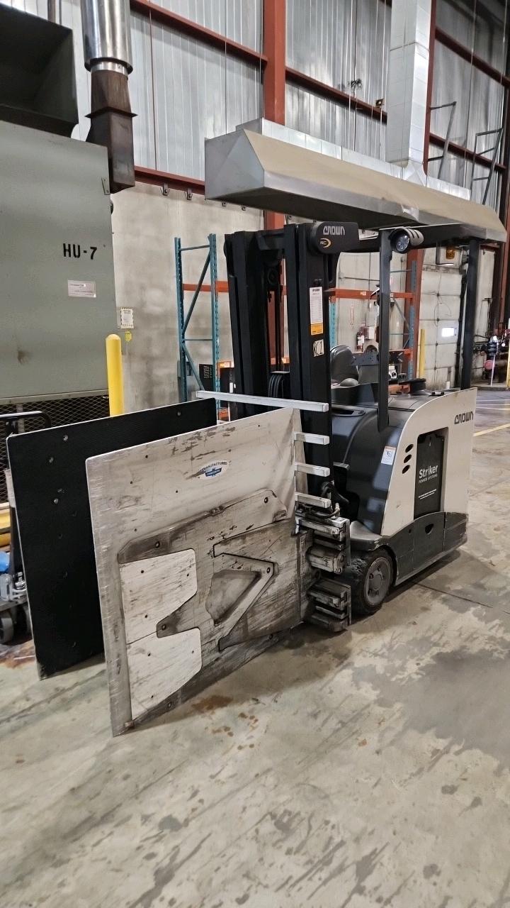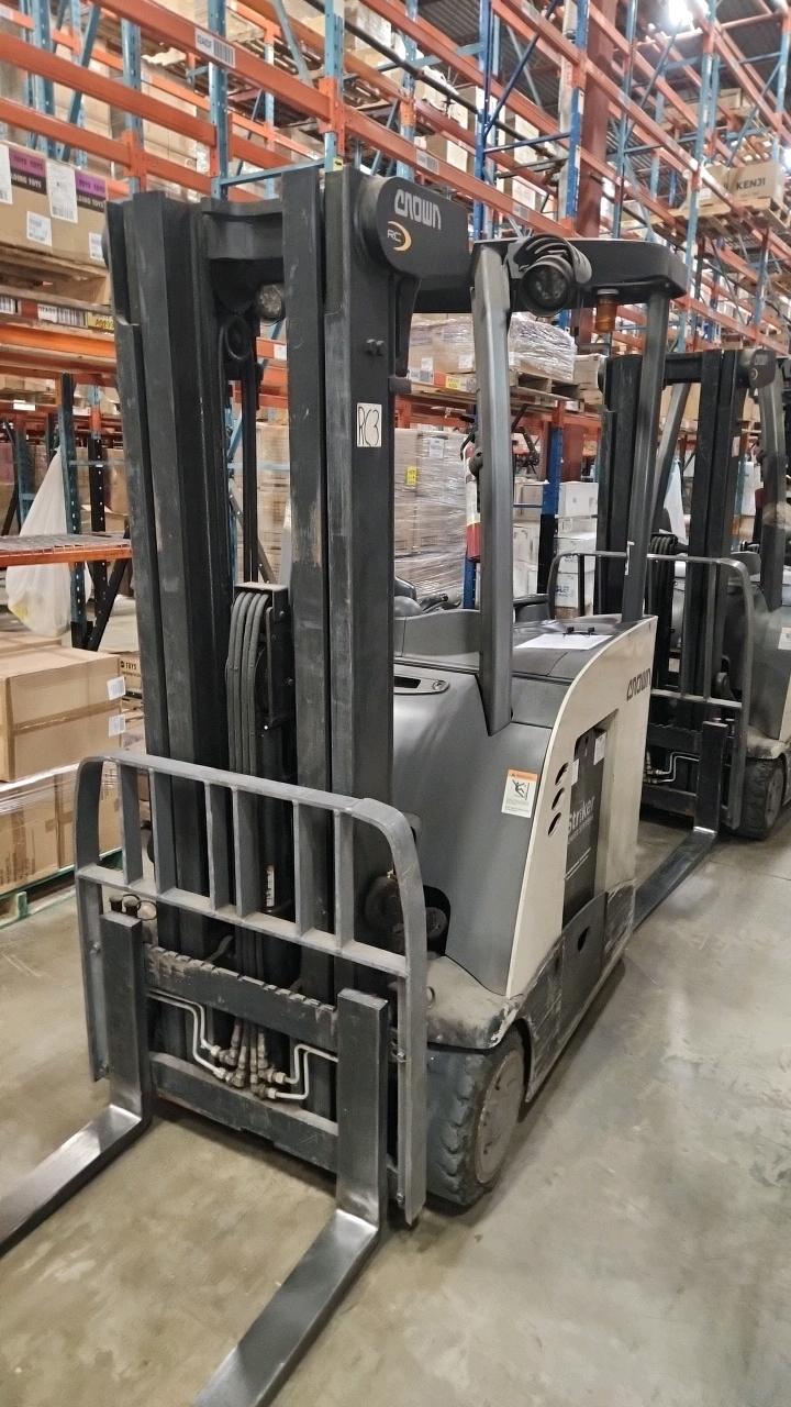 Crown Stand Up Forklift, mod. RC5520-30, ser. 1A479084, 36V., 3000 lb cap, 3286 Hrs., side shift, Comes with Cascade Carton Clamp, cat# 25D-CCS-35Q ser. PTL2131287-1R4, 24\" load center, 2500 lb cap
