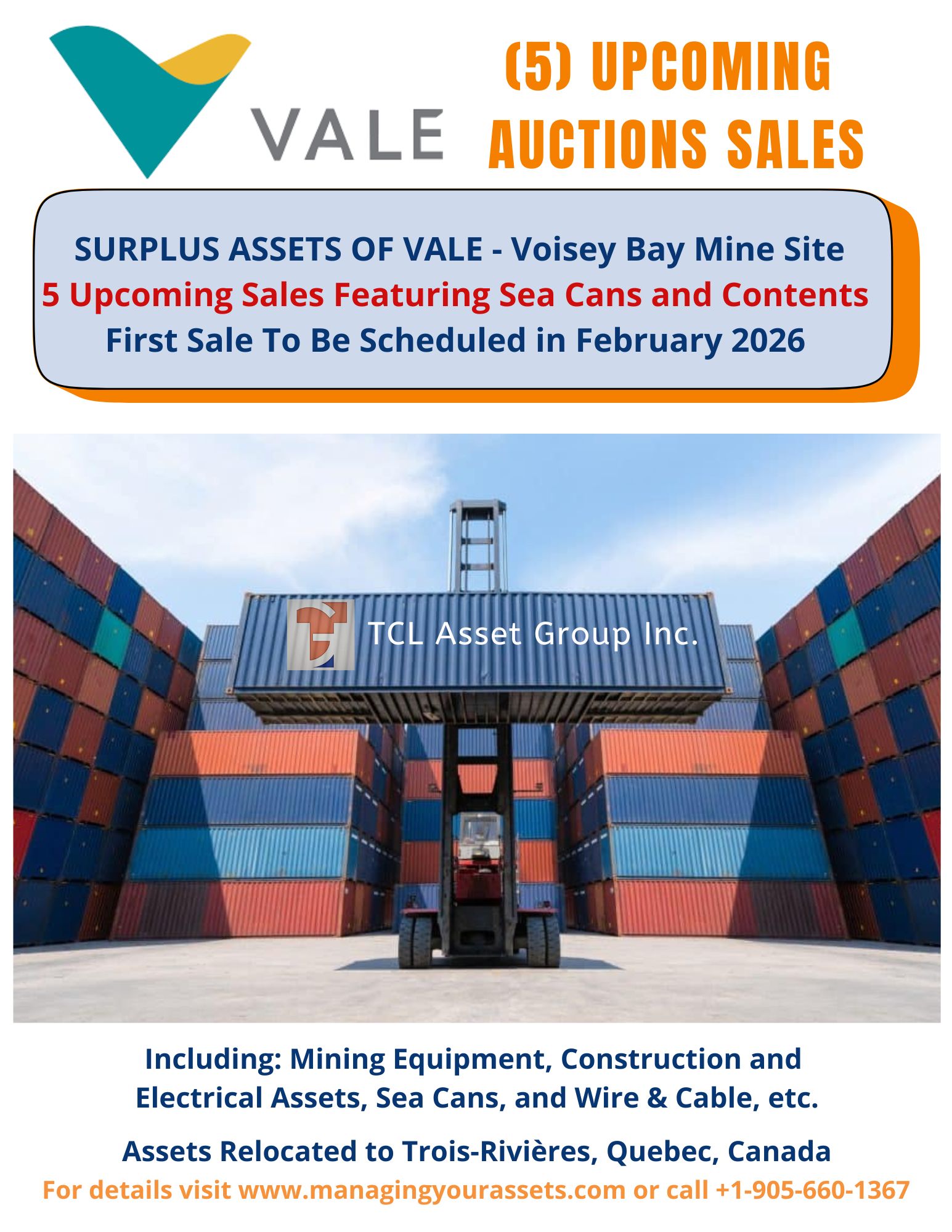 5 Upcoming Sales Featuring: Mining Equipment, Construction and Electrical Assets, Sea Cans, and Wire & Cable, etc. Assets Relocated to Trois-Rivières, Quebec, Canada