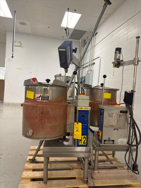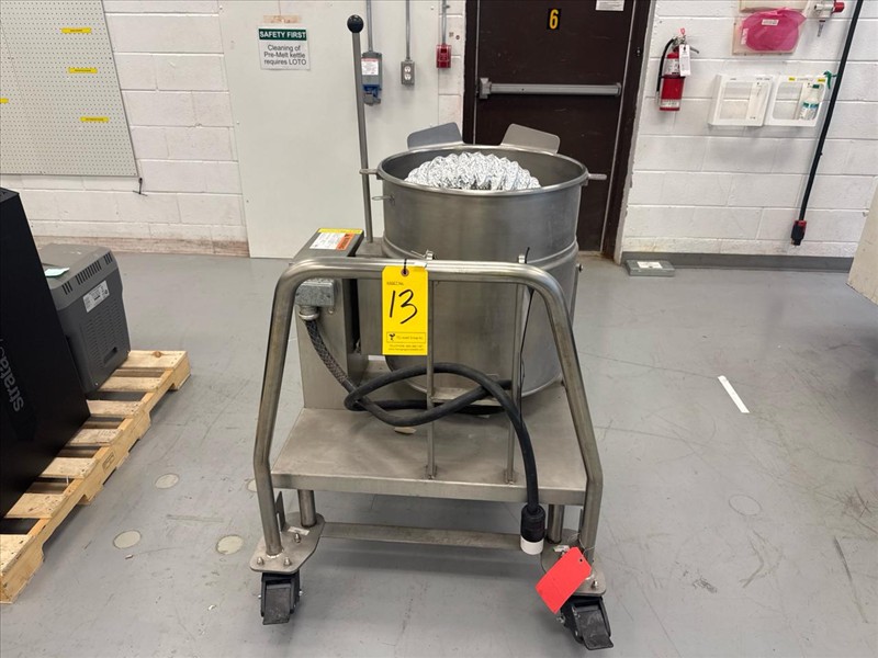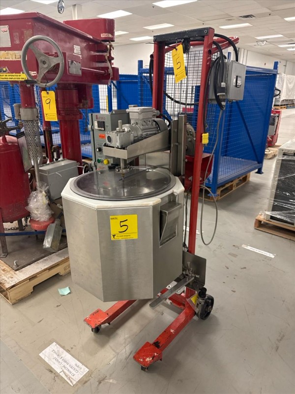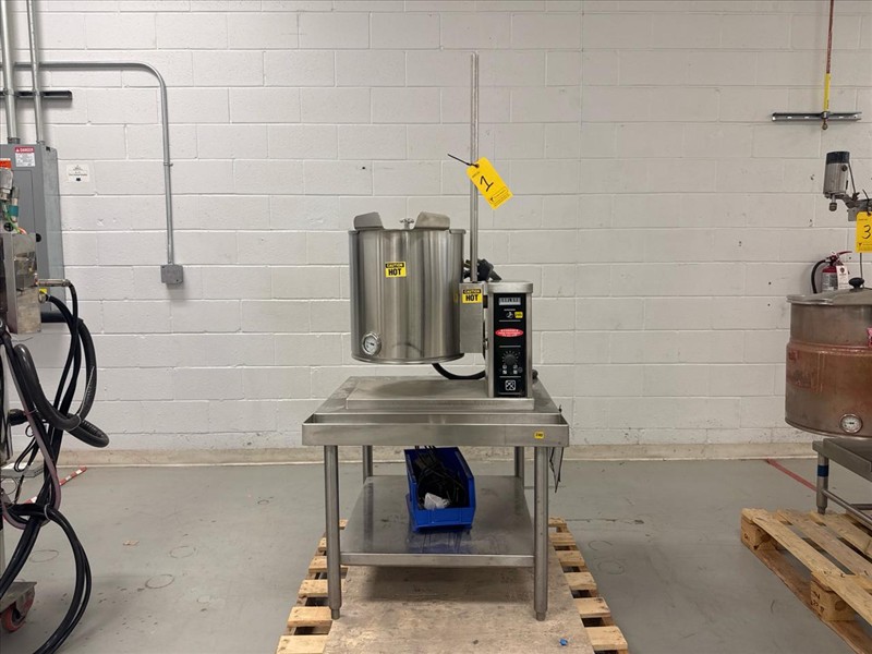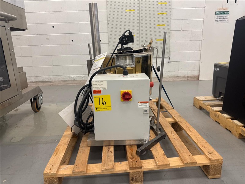 R-J Machinery Inc. Electrically Heated Cone Kettle, ser.no. 2120714, kettle size approximately 16 in. W x 16 in. D, stainless steel, c/w overhead stirrer, 0.16 hp, w/ Mobile Industries inc. Manual Winch Stacker, mod. MW 500, 500 lb. cap.