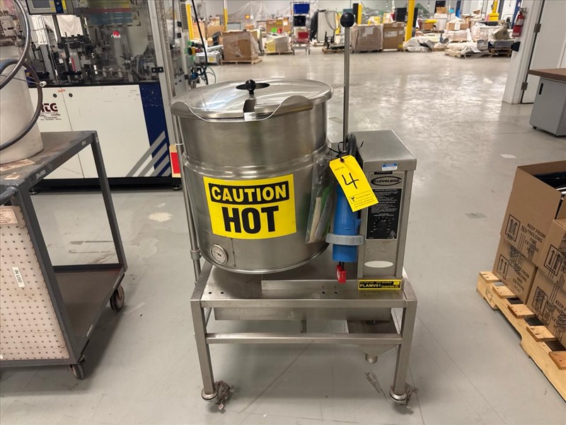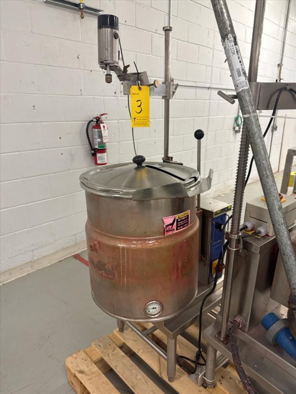 Cleveland Jacketed Electric Tilting Steam Kettle, mod. KET-12-T, ser. no. WT4918-95B10, kettle size approximately 17 in. W x 14 in. D, stainless steel c/w overhead stirrer, VSD