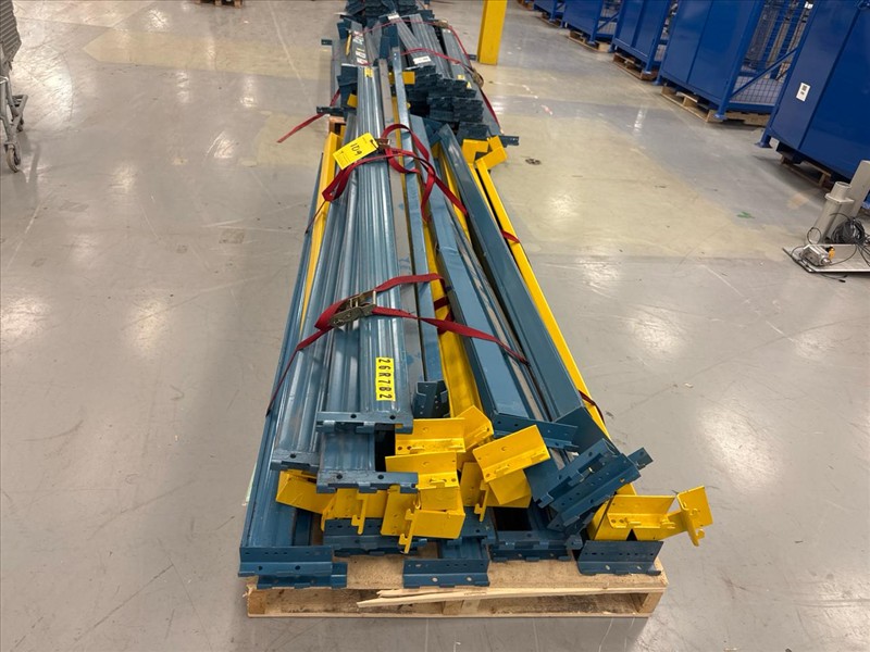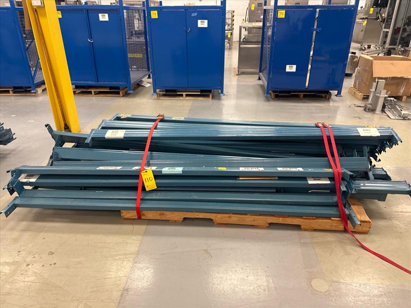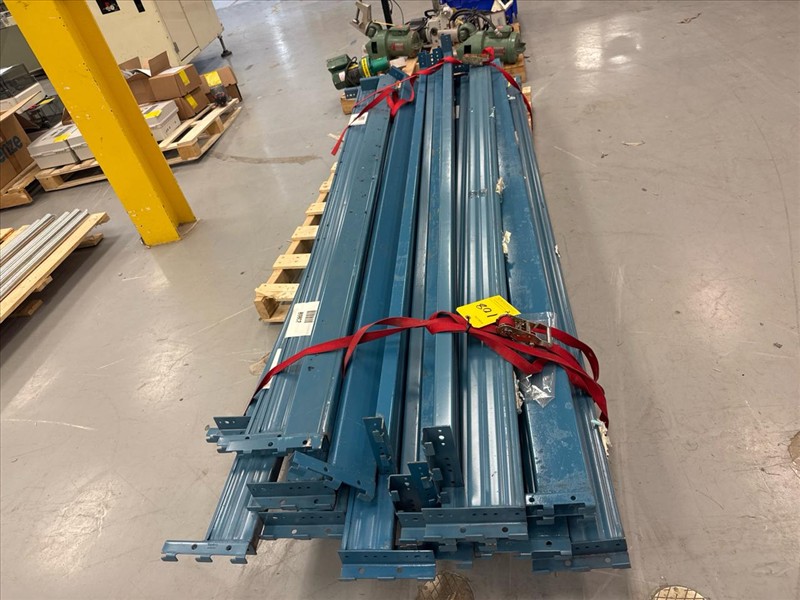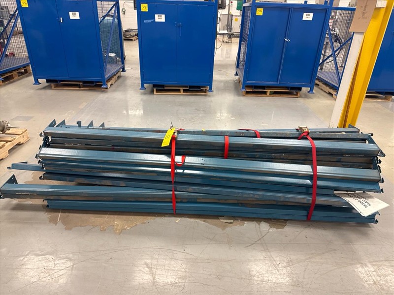 (10) Yellow Pallet racking beams approximately 2 in. W x 8 ft L and (20) Blue racking beams approximately 2 in. W x 8 ft L