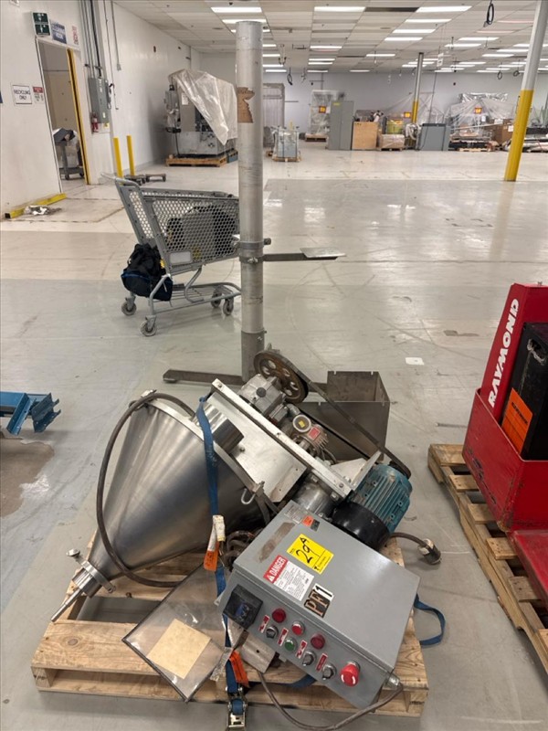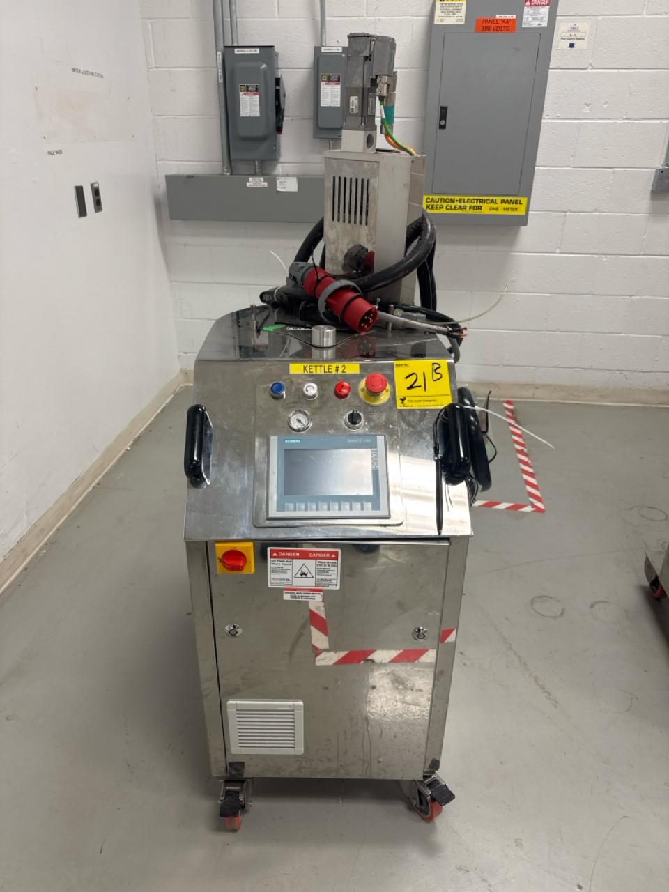 R-J Machinery Inc. Electrically Heated Cone Kettle, ser.no. 2120714, kettle size approximately 16 in. W x 16 in. D, stainless steel, c/w overhead stirrer, 0.16 hp, w/ Mobile Industries inc. Manual Winch Stacker, mod. MW 500, 500 lb. cap.