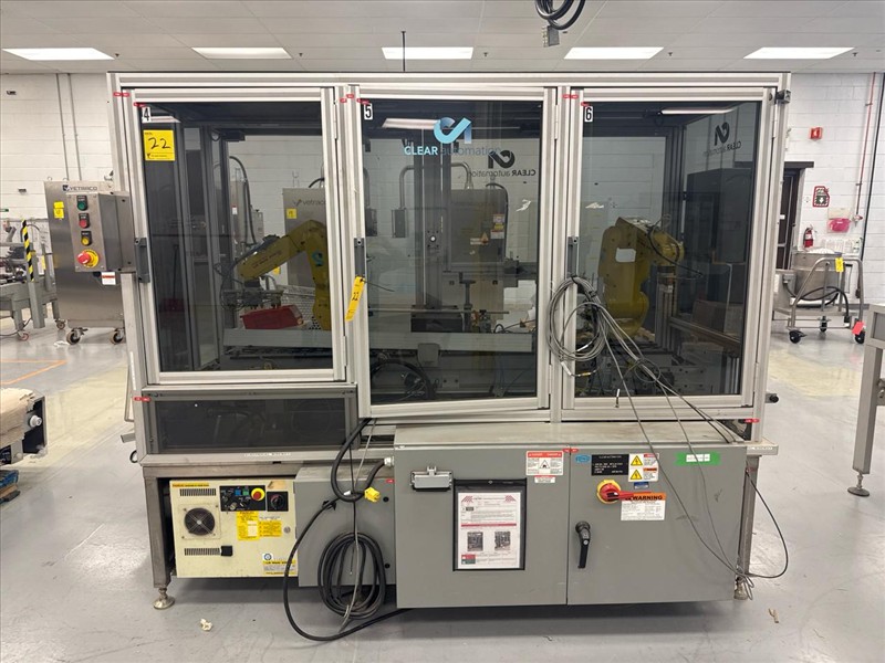 Clear Automation Labeller machine, w/ (2) Fanuc Robots, mod. LR Mate 200iD 7H/R-30iB Mate, conveyor track 7 ft. L x 4 in. W