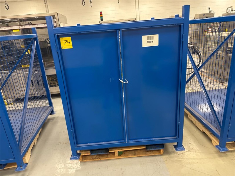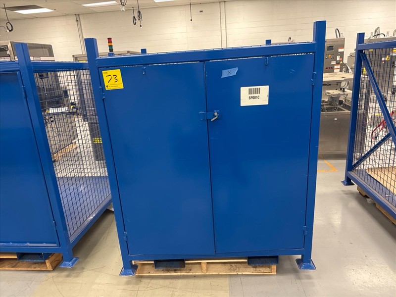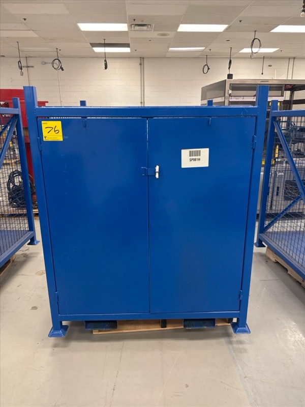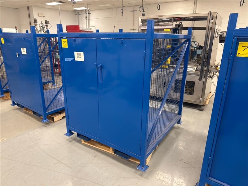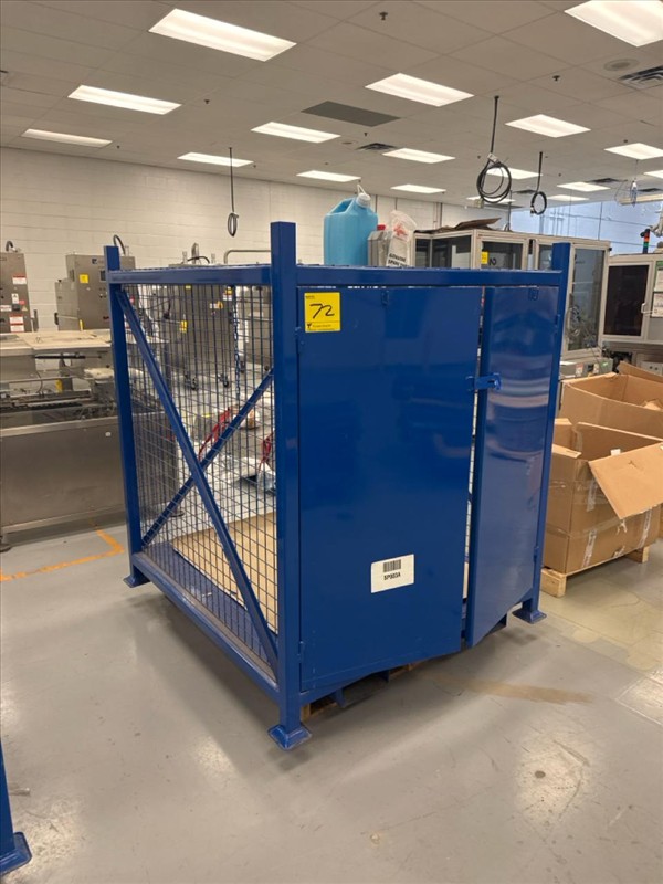 Blue storage cage, approximately 50 in. W x 54 in. D x 59.5 in H. w/ fork slots