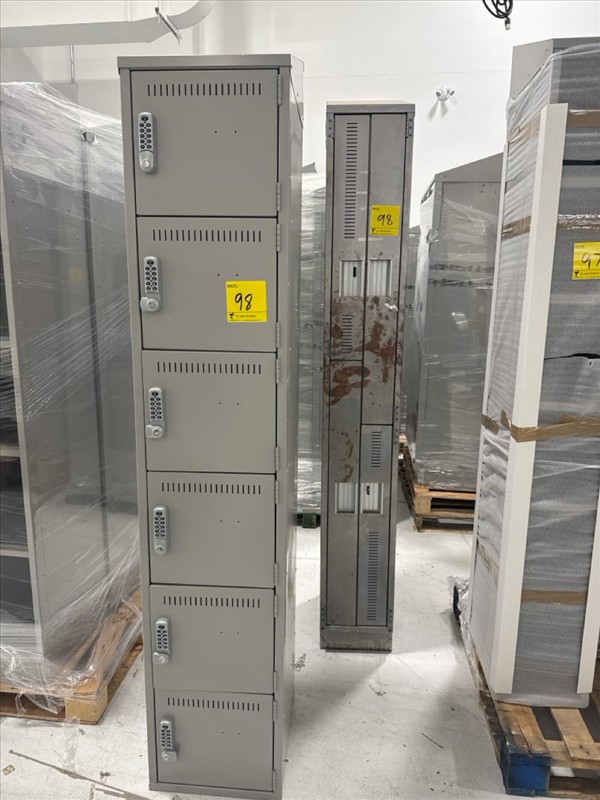 (Qty 2) (1) 6 sectional locker, approximately 16 in. W x 18 in. D x 86 in. H (one door doesn’t open), (1) 2 sectional locker approximately 1 ft W x 18 in. D x 90 in. H